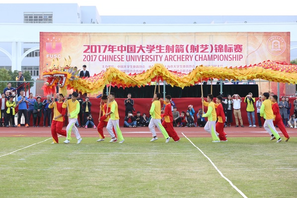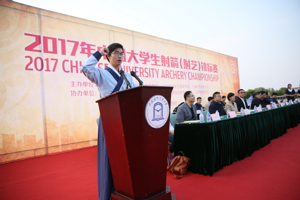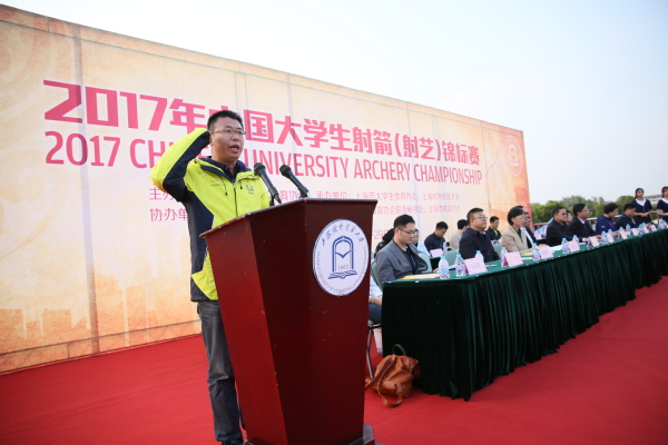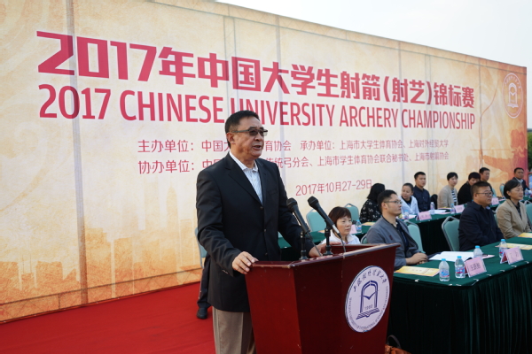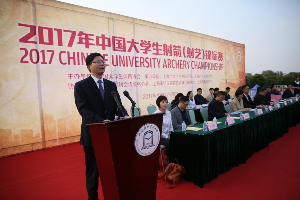 10月27日下午,2017年全国大学生射箭(射艺)锦标赛在我校体育场隆重开幕。此次锦标赛由中国大学生体育协会主办,上海市大学生体育协会、上海市对外经贸大学承办,中国射箭协会传统弓分会、上海市学生体育协会联合秘书处、上海市射箭协会协办。中国大学生体育协会专职副主席王刚,中国大学生体育协会竞赛部主任程洁,国家体育总局射击射箭中心射箭部主任常建东,上海市大学生体育协会会长薛明扬,亚洲射箭协会联合会副主席、中国射箭协会传统弓分会主席、上海市体育局巡视员郭蓓,我校党委书记殷耀,上海市教育委员会体卫艺科处处长丁力,上海市教卫联席会议办公室主任姚颂平,上海市射击射箭运动中心主任王跃舫、中国射箭协会传统弓分会主席名誉主席徐开才、李淑兰以及松江大学城各高校体育部主任和开展射艺学校的领导出席开幕式。开幕式由我校体育部主任崔树林主持。