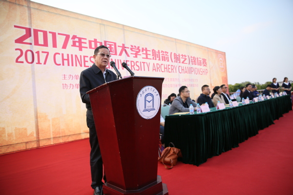 殷耀致欢迎辞。他介绍了我校体育工作的指导思想和教育理念,着重介绍了体育课程和文化等方面的改革与探索。他指出,我校非常重视中国传统体育项目的弘扬和传承工作,开展射艺、龙舟、舞龙、风筝、跳绳、太极拳等中华传统体育项目,构建中华传统体育项目课程群,成立中华传统体育项目教研室,组建学生体育社团,积极参加国内外各级射箭比赛活动。在校园开展射箭项目,既能传承中国优秀体育文化,更能充分发挥“立德树人”的教育目标,也是贯彻和落实习近平总书记在全国高校思想政治工作会议精神的具体体现。希望通过本次锦标赛既能够加强我国高校间师生的交流,积极促进中华传统体育文化的进一步传承,为弘扬和传承中华传统体育文化做出贡献。