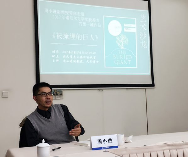 本次学术沙龙由《被掩埋的巨人》一书的译者、我校外语学院周小进副教授主讲,周老师从《被掩埋的巨人》一书的故事梗概入手,引导大家了解“怎么读石黑一雄”“石黑一雄的时间观”“石黑一雄的审美境界”等,阐述了作者的文学风格,教会大家在慢阅读中体会内省的收获。之后在场的老师和同学们针对作品、作者以及文学翻译创作等问题与周老师进行了热烈的讨论,沙龙结束后还进行了签名赠书活动。