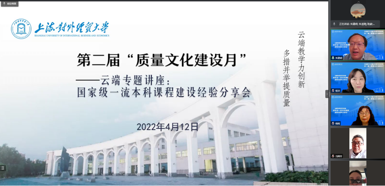 为推进质量文化建设,充分发挥一流本科课程的示范引领作用,树立课程建设新理念,推进课程改革创新,提高教师教学水平和教学质量,4月12日下午,学校举办了SUIBE“云端专题讲座”系列活动第二场——国家级一流本科课程建设经验分享会。本次活动邀请了我校国家级一流本科课程负责人秦淑娟、张秋菊、沈克华、程洁四位教师作建设经验分享,各教学单位副院长、市一流课程负责人、市级重点课程负责人和教师代表等共70余位教师参加。