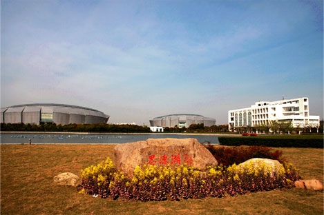 | 教学楼位于校园东侧,龙兴港河水环抱,有A、B、C、D四幢,建筑结构以巨大圆形立柱、流线型拱墙为特征。教学楼东侧由长100余米、高10余米的28根弧长型柱廊贯通;西侧由长154米、高23米的西山墙联结。西山墙由3个直径达24米的圆景洞组成,三圆左右并行,寓意在航海贸易的行程中,朝气蓬勃的太阳从海平面上冉冉升起,构筑了校园一道亮丽的风景线。 |