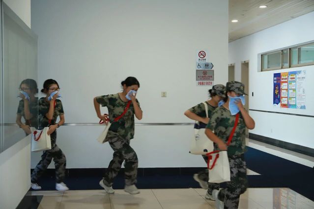 随着军训总指挥、校党委副书记、副校长沈艺宣布演练开始,学思楼A楼内,消防警报响起,模拟烟雾弥漫走廊。参训学院在教官的引导下,用湿毛巾捂住口鼻,沿指定疏散路线低姿快速撤离。整个过程紧张有序。