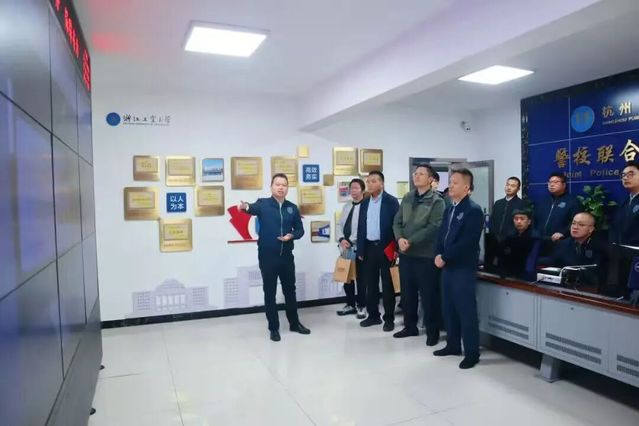 在张伟锋的陪同下,调研组实地参观了警校共建党员服务站、校警驿站、警校联合勤务指挥中心和微型消防站。这些实体化平台充分展现了浙江工业大学在警校联动、协同育人、应急处突方面的系统化构思与标准化建设成果。