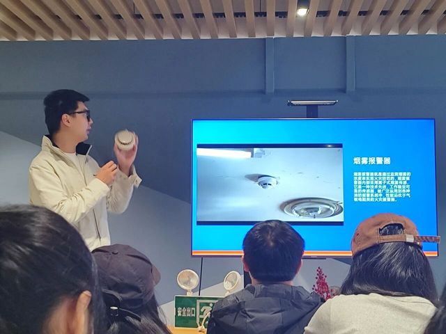 在讲解火灾紧急处置措施时,顾老师指出,吸入有毒烟雾是火场致命的首要因素,占比近八成。他强调,用湿毛巾捂住口鼻是减少烟雾吸入的关键举措。疏散时,务必保持冷静,遵循应急照明与防火门指示有序撤离,严防拥挤。他在现场还指明了宿舍楼内灭火器的具体位置,公布了保卫处消防联系渠道,并重申119、120等应急电话的正确使用规范,强调自救互救须以保障自身安全为前提,切忌盲目施救。顾老师随后介绍了校园消防系统的构成与维护机制,包括烟雾报警器、应急照明设备的功能及异常反馈途径,鼓励师生发现设施问题及时上报。