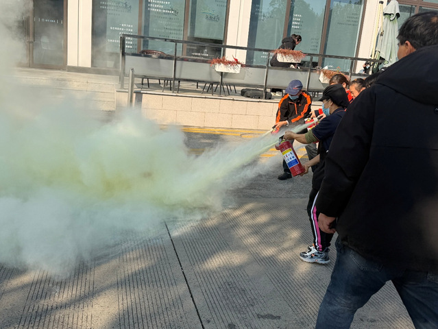 随后转入灭火器实操体验环节。蒋建伟现场讲解了干粉灭火器的构造、工作原理及“提、拔、握、压”四字口诀,并进行了标准的操作演示。食堂工作人员认真观摩后,轮流上场进行实操练习,有效掌握了灭火器的正确使用方法,提升了初期火灾的应急技能。