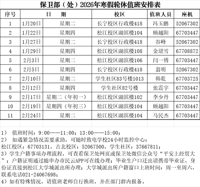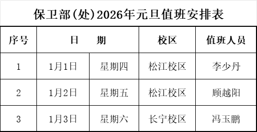保卫部(处)2026年元旦、寒假轮休值班安排表
