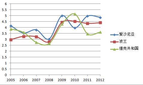 从研究情况来看,爱沙尼亚、波兰、捷克三个国家投资环境得分在2005~2012这八年期间始终名列前茅,小幅波动、明显上扬。是属于中东欧十六国中投资环境相对最好的国家,而且越来越好。