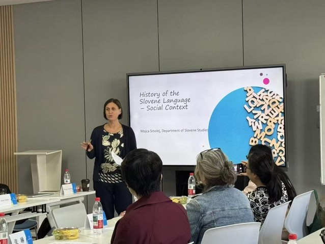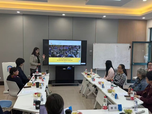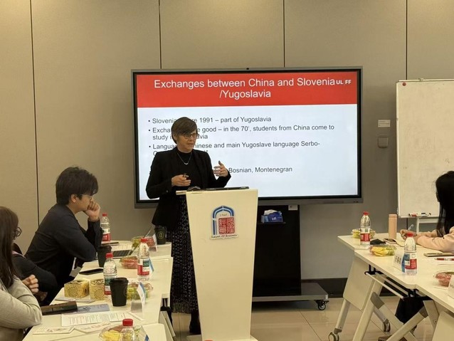 11月10日下午,上海对外经贸大学中东欧研究中心和国际商务外语学院共同主办的“Slovenia in Words and Worlds: Language, Culture, and Society in a Global Context”学术论坛活动在松江校区博识楼113室成功举办。来自卢布尔雅那大学人文艺术学院、北京外国语大学、华东师范大学、上海对外经贸大学中东欧研究中心和国际商务外语学院的专家学者,以及国际经贸学院、国际商务外语学院的30余名研究生共同参与了本次论坛。会议由上海对外经贸大学中东欧研究中心主任廖佳主持。
