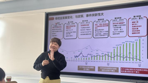 讲座的最后环节,李雪鹤女士通过时间轴的形式,清晰呈现了中国保险行业自1992年以来的六个演变历程,从早期的产品单一、市场规模有限,到如今的产品多元化、服务场景化,让同学们直观感受到行业的快速发展与巨大变革。结合当前行业环境,她着重强调,在低预定利率成为行业常态的背景下,长期分红具备显著的增长潜力。