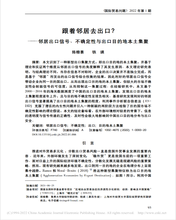 陈榕景、铁瑛(通讯作者) | 跟着邻居去出口?——邻居出口信号、不确定性与出口目的地本土集聚 | 国际贸易问题 | 2022(01) | 93-112 | B1 |