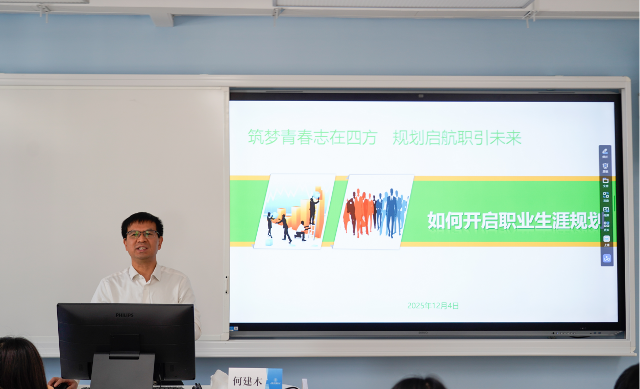 为帮助学生做好职业生涯规划,提升就业竞争力,12月4日下午,国际组织学院(贸易谈判学院)在松江校区举办“鲲鹏计划”行业导师沙龙,邀请学院行业导师、中国(上海)自由贸易试验区管理委员会陆家嘴管理局党群工作处处长、上海陆家嘴企业服务有限公司董事长兼总经理何建木,为学生开展职业生涯规划指导。学院党委书记刘素贞,辅导员王元昆、马铭萱及学生代表60余人参加。讲座由学院党委副书记程栋主持。何建木老师以自己读研期间室友同学们的职业规划和成长历程为案例,强调了做好职业规划的重要意义。他系统阐述了职业规划的核心概念与八大原则,结合帕森斯、舒伯、克朗伯兹等职业生涯理论,引导学生树立终身发展的职业观与科学的就业观。他鼓励学生坚持学习、拓宽视野,立足自身特点,响应社会需求,将个人成长融入国家发展大局。何建木老师还围绕全国大学生职业规划大赛,介绍了如何通过参与赛事提升职业规划能力和就业竞争力。他详细介绍了赛事过程和赛事综合考察要素,指出该赛事不仅是竞技平台,更是引导学生开展系统性、阶段性职业规划的重要载体,能够帮助同学们主动开展自我评估和职业探索,从而建立起贯穿大学全程的动态规划体系。他鼓励同学们积极参赛,借助