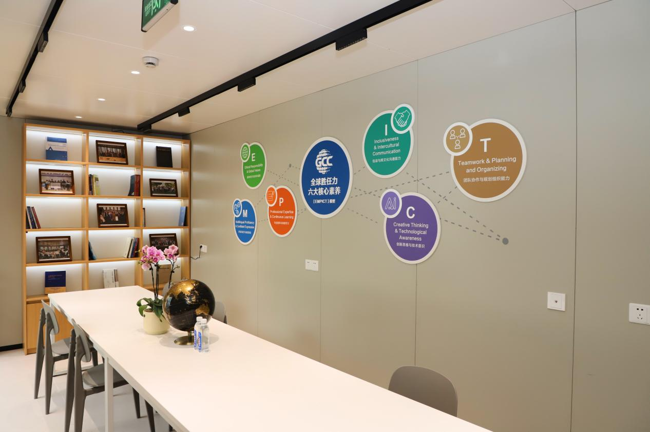 在展厅,师生可研读国际组织与全球治理杂志书籍,观赏全球性商品贸易展览,浏览全球胜任力中心活动影像,见证学校师生迈向国际舞台的坚实足迹。展厅还设置了特色文创和咖啡休憩区,方便师生捧卷沉思、围坐畅谈,在方寸之地感受多元文明交融之美。