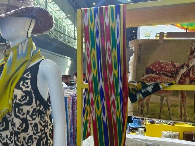 展台上,艾德莱斯丝绸制品形态丰富:服饰将流动纹样与时尚剪裁相融,兼具曳地长裙的优雅与利落西装的现代感;抱枕、挂毯等家居饰品以斑斓图案诉说丝路故事。这些展品既是工艺呈现,更是文化交融载体,既含新疆本土民族符号,又吸纳丝路沿线元素,成为中外文化对话的生动媒介。与参展企业交流得知,其通过“文化赋能+品质输出”拓展市场,海外订单聚焦特色文创与高端服饰,国内采购商则关注家居饰品等日常品,为项目提供了直观参考。