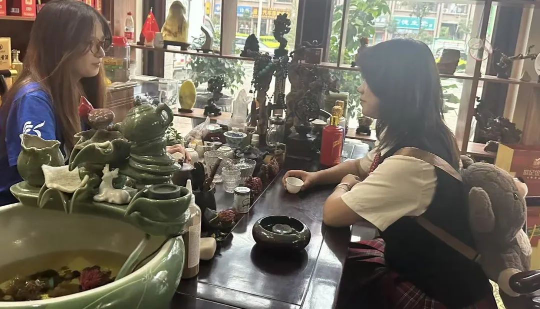 “西湖龙井博物馆的光影与茶香,让我触摸到千年茶魂——从陆羽沉思到乾隆题咏,器物陈列间藏着文化的生命力。在小小茶摊下,白发长者含笑细调一杯茉莉蜜饮,活泼孩童踮脚为果茶添上晶莹脆啵啵,笑声在茶香里浮漾。方寸摊位间流淌出属于社区的温润人情味,亦悄然织就一份关于茶与生活的真实画卷。”施文译在调研中感慨,茶的真谛恰如人生,在沉静中释放悠远醇香。马翊芸则从暑托班课堂获得启发:“化不必高深,当一片茶叶在孩子心里种下好奇,当敬茶礼仪成了他们的小习惯,便是最好的传承。”王春在云亭茶楼调研中体会深刻:“‘熟客留座’‘按需调浓度’的细节,印证了最好的经营是让人感到‘被重视、合心意’,这正是传统与现代融合的精髓。”