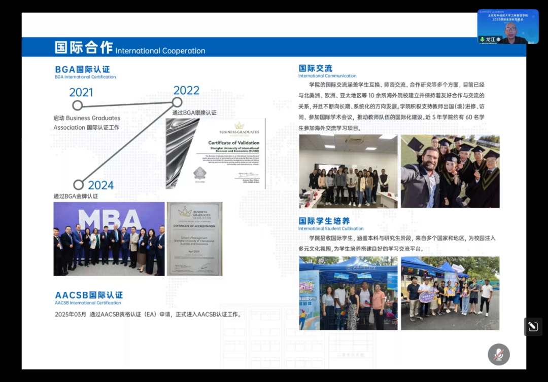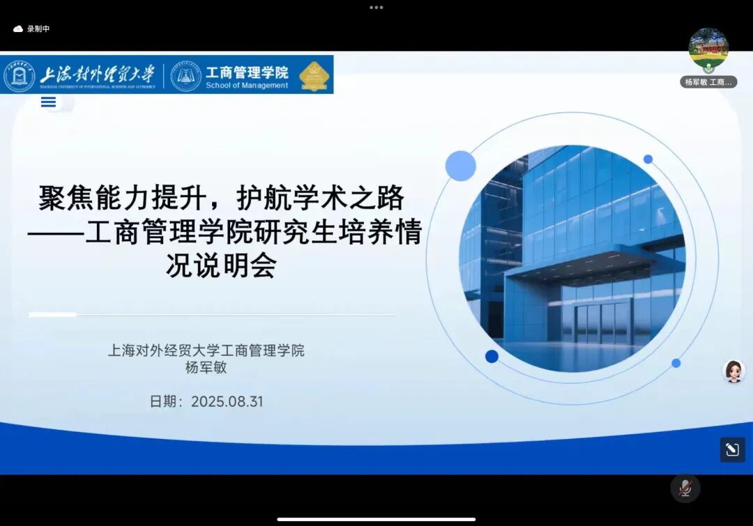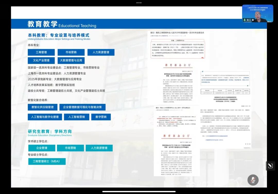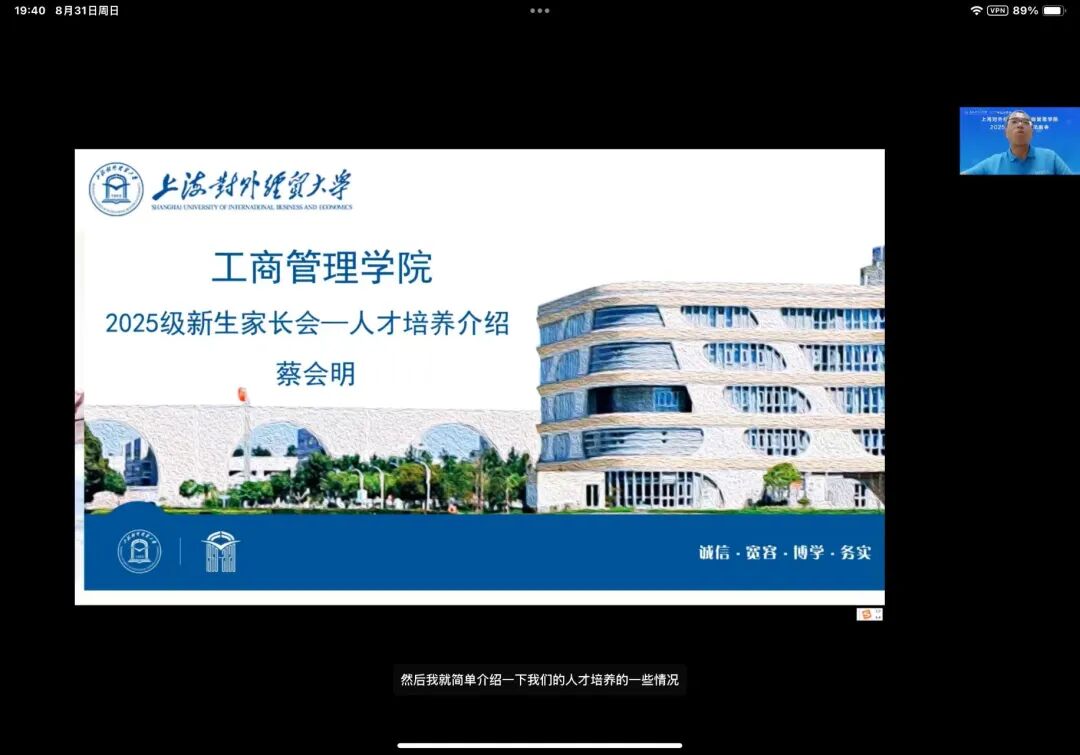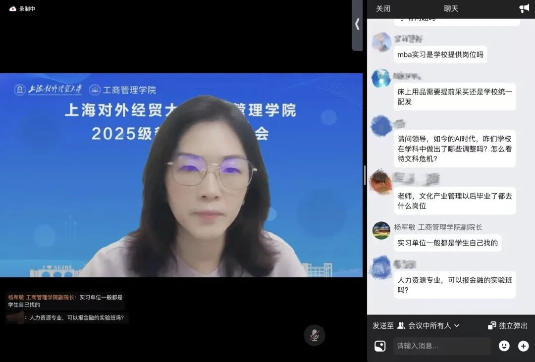 为落实立德树人根本任务,促进家校育人机制的规范化和科学化,帮助新生适应大学生活,8月31日下午,工商管理学院顺利举办2025级新生家长见面会。工商管理学院党委书记武增勇、院长龙江、党委副书记张瑞娟、副院长蔡会明、副院长杨军敏、团委书记胡心钰、25级本科生辅导员沈依琳以及2025级本硕新生家长齐聚云端,共同探讨学生未来发展。本次会议由学院党委副书记张瑞娟主持。