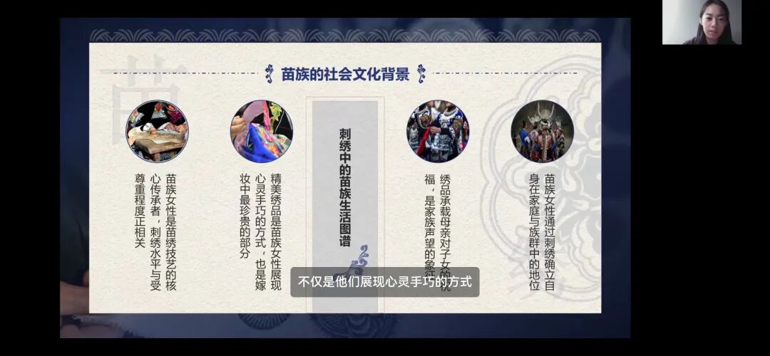 志愿者以苗族的非遗苗绣为主,讲述了苗绣的起源与发展、苗族刺绣的特点、苗族刺绣的传承之路,以及苗绣的创新发展。志愿者为西藏小朋友们讲述了刺绣在苗族社会中是女性成长的必修课,承载着民族历史与情感,并为同学们展示了不同地域的苗族刺绣风格。