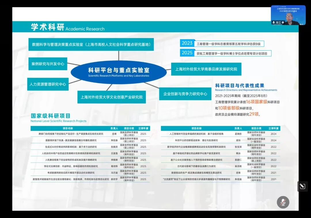 为落实立德树人根本任务,促进家校育人机制的规范化和科学化,帮助新生适应大学生活,8月31日下午,工商管理学院顺利举办2025级新生家长见面会。工商管理学院党委书记武增勇、院长龙江、党委副书记张瑞娟、副院长蔡会明、副院长杨军敏、团委书记胡心钰、25级本科生辅导员沈依琳以及2025级本硕新生家长齐聚云端,共同探讨学生未来发展。本次会议由学院党委副书记张瑞娟主持。