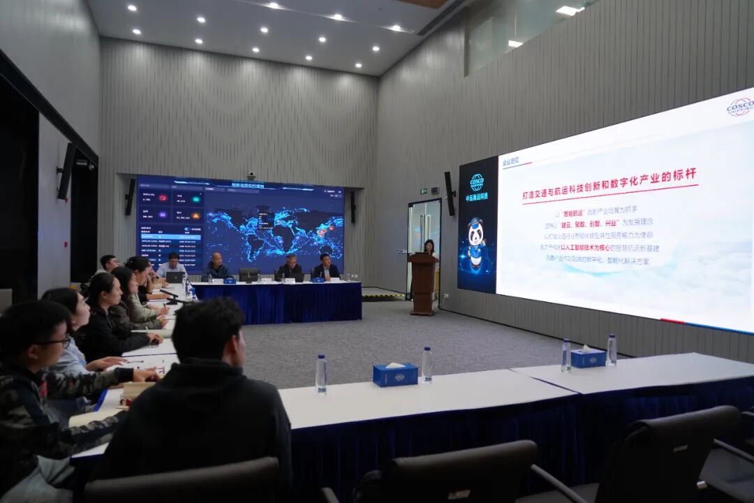 中远海运科技研发创新中心总经理韩懿、企业数字化服务事业部总经理付国宝、SAP实施部副总经理李文俊、研发创新中心高级研发工程师陈敏热情接待了参访师生,并围绕企业发展战略、核心业务布局、技术创新成果等内容展开深度分享。