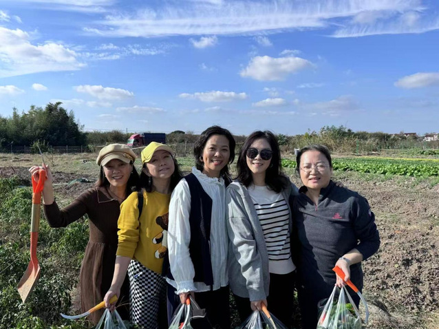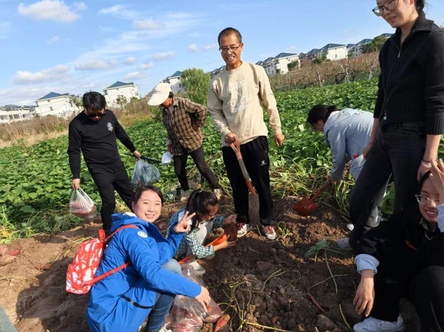 活动日上午,教职工抵达了素有“千年盐场”之称的新场古镇。这座始建于南宋的历史文化古镇,完整保存了规模可观的明清建筑群。大家漫步于青石板路上,欣赏白墙黛瓦与水乡河道的相映成趣,感受浓厚的历史底蕴与宁静雅致的江南水乡氛围,仿佛置身于一幅流动的水墨画卷之中。下午,活动转入充满生机的田园体验环节。教职工前往农庄进行农产品采摘,体验采摘青菜、辣椒以及挖掘红薯的乐趣。在轻松愉快的劳作中,大家既放松了身心,也近距离感受到了秋日丰收的喜悦。
