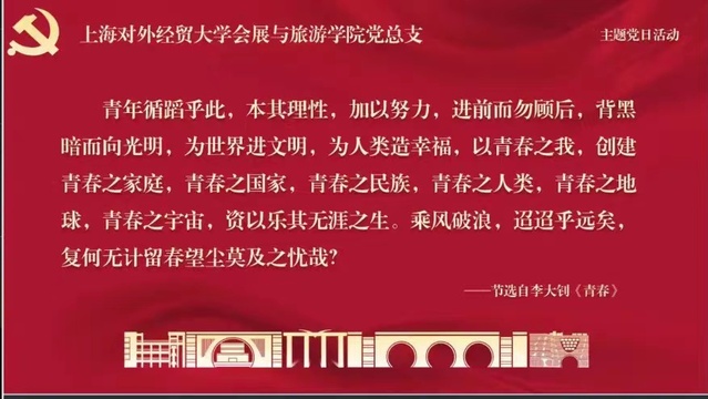 在上海本轮疫情的特殊时期,我院会展与旅游学院的党员教师、学生通过多种方式、多维度地参与抗疫志愿服务中,为学习和宣传他们的事迹,引导大家提高思想认识、端正入党动机,汲取力量,坚定信心,进一步加强疫情期间党员教育管理,结合习近平总书记在中国人民大学考察时重要讲话精神,于4月29日晚,专门组织开展了“抗疫争先锋 青春话担当”抗疫志愿者事迹宣讲主题党日活动暨毕业生党员离校教育。学院领导班子、教师代表、组织员、辅导员及全体学生党员、发展对象和入党积极分子参加了本次会议,由本科生党支部书记王元义主持。