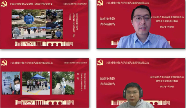 在上海本轮疫情的特殊时期,我院会展与旅游学院的党员教师、学生通过多种方式、多维度地参与抗疫志愿服务中,为学习和宣传他们的事迹,引导大家提高思想认识、端正入党动机,汲取力量,坚定信心,进一步加强疫情期间党员教育管理,结合习近平总书记在中国人民大学考察时重要讲话精神,于4月29日晚,专门组织开展了“抗疫争先锋 青春话担当”抗疫志愿者事迹宣讲主题党日活动暨毕业生党员离校教育。学院领导班子、教师代表、组织员、辅导员及全体学生党员、发展对象和入党积极分子参加了本次会议,由本科生党支部书记王元义主持。