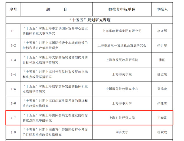 近日,上海市商务委员会公布了 “十五五”规划研究和2025 年度商务专项调研招标结果,我院院长王春雷教授带领的团队凭借深厚的学术积淀、前沿的研究视角和较丰富的实践基础,申报的《“十五五” 时期上海国际会展之都建设的指标和重点政策举措研究》项目在激烈竞争中脱颖而出。