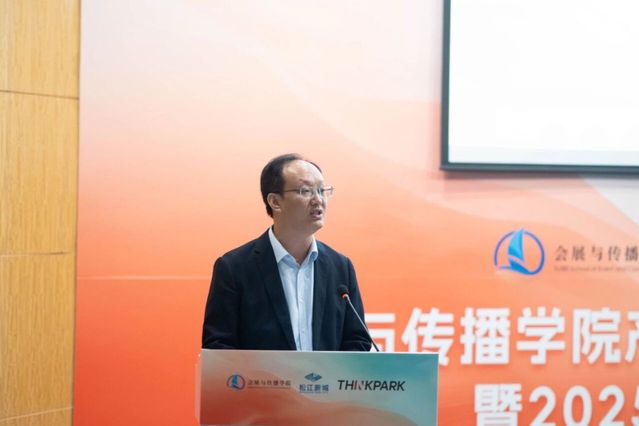 朱建明为典礼致辞。他向一直以来关心支持学校和学院的产业行业同仁表示衷心地感谢。他表示,会展与传播学院以三大专业为核心、形成“理论教学——实践实训——社会服务”三位一体育人模式,积极培养复合型人才。他指出,学院新设“新城集团创新文旅人才班”“思库传播人才班”,将构建多专业融合格局,是产教深度融合的系统化培养模式。同时,他勉励新生,要拥抱“融合”、敢于“实践”、涵养“格局”,立志成为引领未来的卓越人才,在真刀真枪中练就真本领。