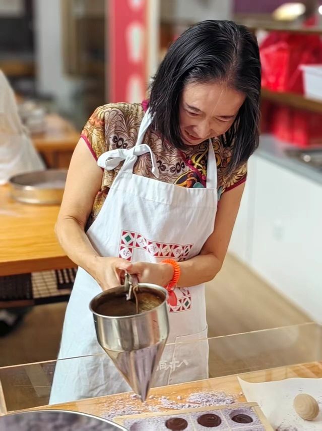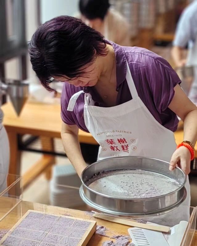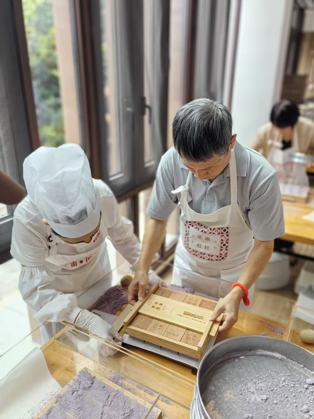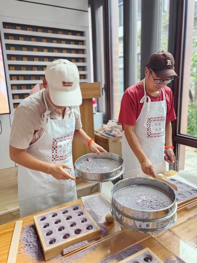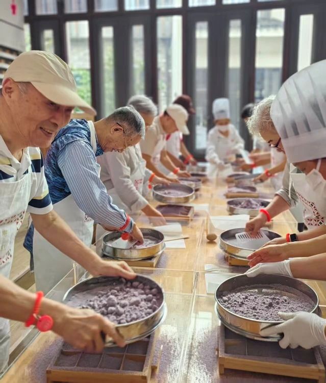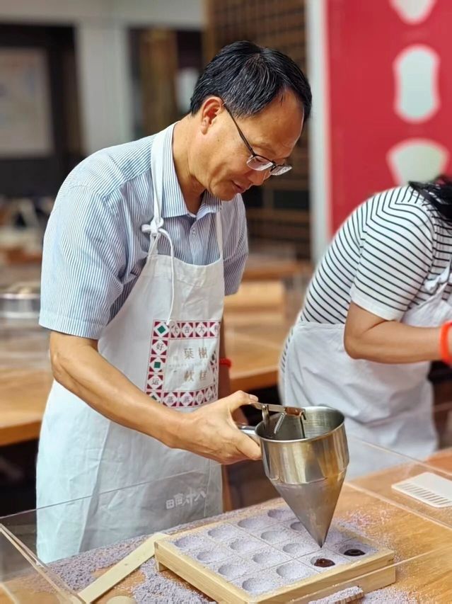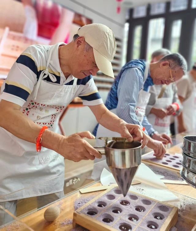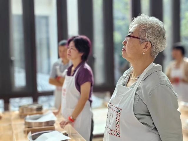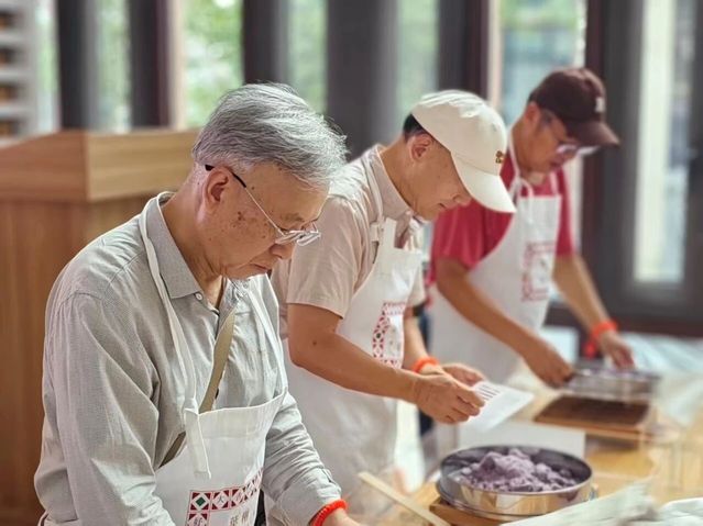 午后,老同志们前往松江广富林“八十八亩田”非遗工坊,亲手制作非遗叶榭软糕,学院领导班子陪同前往。在非遗传承人的指导下,大家揉面、制馅、塑形,将重阳传统与地方风味融入软糯糕点中。老同志们纷纷感慨:“一块软糕承载着松江的文化记忆,更让我们感受到学院大家庭的温暖。”