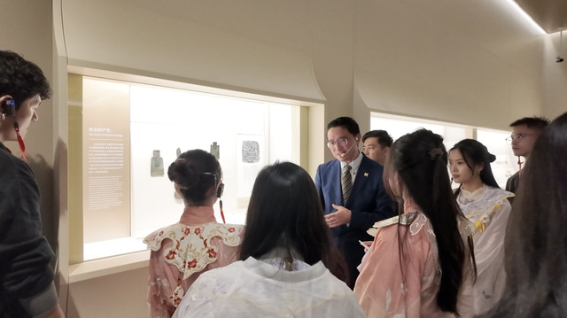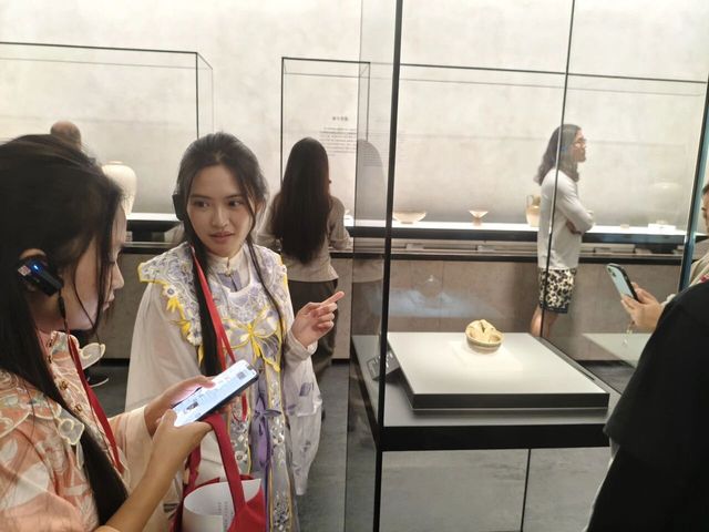 整场讲解以《长安荔枝》故事为穿针引线:留学生先披上唐制圆领袍,腰佩“荔枝使”鱼符,在讲解员带领下站在“开元通宝”前,了解唐代货币、铜器铸造工艺与漕运财政;步入瓷器展区,聆听“南青北白”贡瓷如何沿大运河抵达长安。最后,众人移至大堂回廊,与讲解员一起还原小说情节以中文对白完成验符、换马、呈果的完整流程,切身体会沉浸式讲解如何靠“故事+文物+角色”实现游客情绪代入与知识传递。