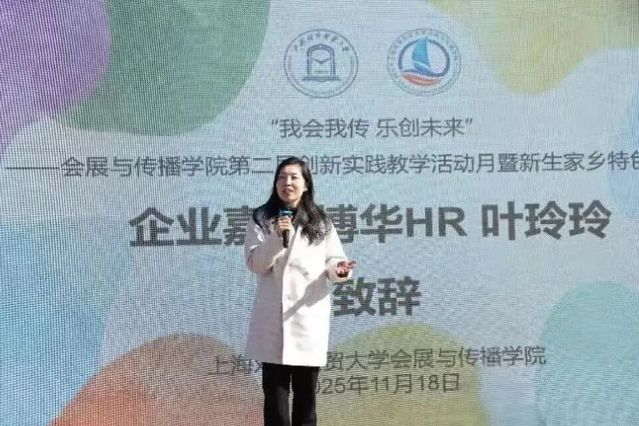 副校长徐永林出席活动并致辞,上海博华国际展览有限公司HR叶玲玲,各学院及职能部门代表、师生代表共同参与。开幕式由会展与传播学院副院长叶青青主持。