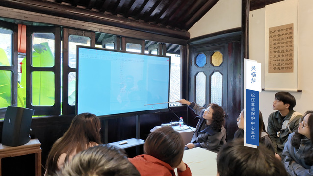 随后,松江区非遗保护中心主任吴杨萍逐一介绍了松江现有各级非遗项目的特点、文化意义和传承发展现状,直指“高龄化、弱流量、缺场景”三大传承痛点。面对上述痛点,吴主任现场发出“青年共创”倡议,号召旅游管理专业学生充分发挥专业特长,以旅游叙事重构非遗话语体系,用研学线路设计激活在地体验,借数字传播工具拓展线上流量,通过“内容共创、场景共建、价值共享”模式,让传统技艺与产业运营实现双向奔赴,真正使“老手艺”转化为“新流量”,让“旧遗产”衍生“新经济”。