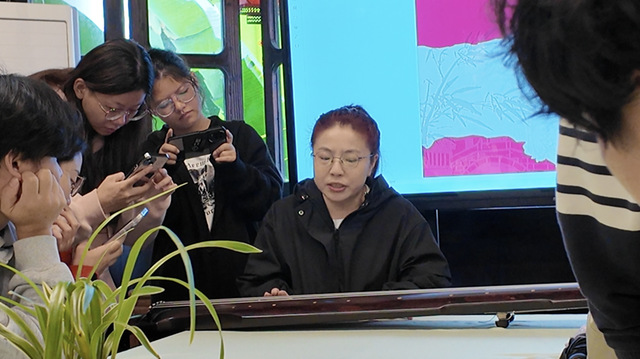 雕花楼内,同学们沿回廊依次观摩舞草龙模型、余天成堂老药柜及捣药杵、竹编灯彩等实物展陈,木梁雕花与展板图文互为映衬,直观呈现松江非遗与市井生活的历史链接。移步二楼手工区,顾绣传承人示范“劈丝”——将一根花线劈至1/16细度,学生在老师指导下逐一尝试,并在老师协助下完成穿针引线;古琴体验活动中,指导老师演示散、泛、按三种基本音,同学轮流拨弦采集音高与振幅,感受古琴的魅力。