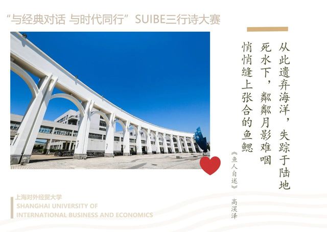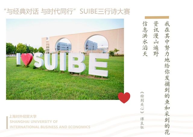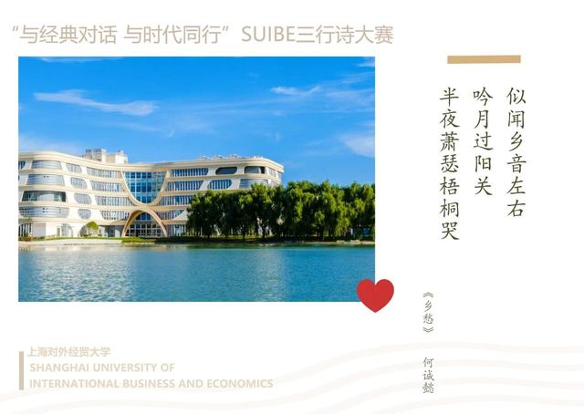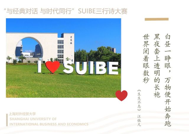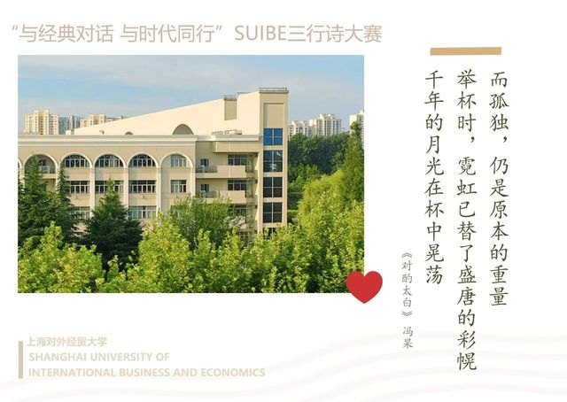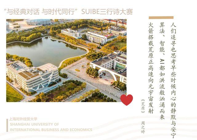 近日,我院人文教育与研究中心举办的 “与经典对话,与时代同行”SUIBE三行诗大赛圆满落幕。经过层层筛选,55份作品从三百多份投稿中脱颖而出。这些作品或致敬经典,或关注时代,于三行方寸之间,见真挚情思与家国情怀,充分展现了当代大学生“腹有诗书气自华”的青春风采。我们将部分优秀作品制作成明信片和短视频,与大家分享,让我们一起感受青春的脉搏和时代的心跳。