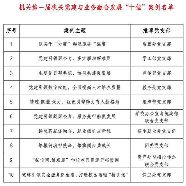 活动开展以来,机关各党支部高度重视,积极申报,对本支部推进党建和业务深度融合的典型经验和实际成果进行总结提炼和择优推荐。在党支部推荐申报的基础上,按照公开、公平、公正原则,综合考虑案例的真实性、完整性、创新性、融合性、典型性,评选出机关第一届机关党建与业务融合发展“十佳”案例。
