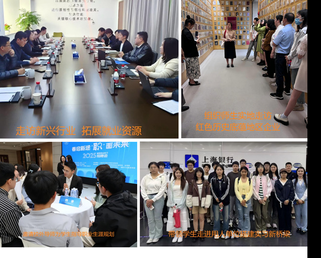 成效:两年来,通过“1+2”牵手行动,支部间先后开展领学研讨等活动 9 次、红色研学3次、“行走的党课”6次;举办就业活动20余场,提供职业咨询97人次,推送岗位信息800余条,精准推荐岗位700余个,助力50余名学生就业。通过“1+2”牵手行动,师生关系更加紧密,学生综合素质与就业能力得到有效提升。例如,翻译专业的硕士研究生小张同学在党员教师的指导下,积极参加暑期实践、提升专业能力、认真学习面试技巧,最终成功获得曼伦快消公司的录用通知,薪资待遇优厚。她表示:“党员老师的关心和指导让我在学业和就业上都取得了很大进步,非常感激。”