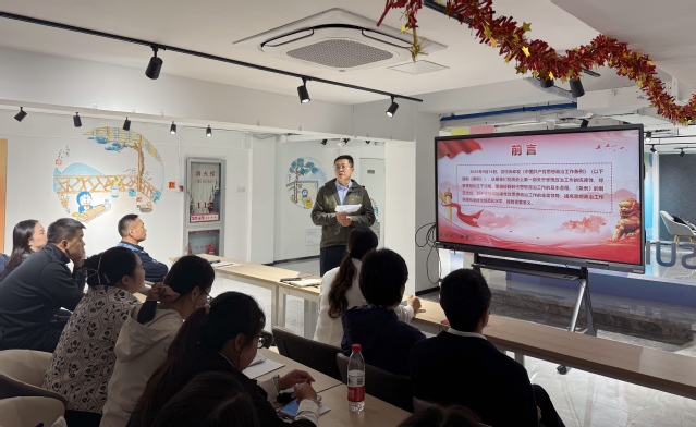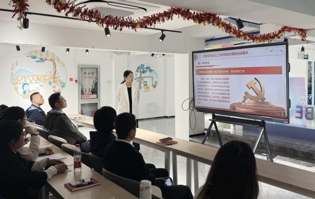 学工部党支部书记缪韵笛结合学生工作实际,从四个方面深入解读《条例》精神:一是熟悉《条例》的主要框架与思想政治工作的内容任务;二是准确把握思想政治工作的地位作用和总体要求;三是深刻领会做好思想政治工作的核心要义与基本要求;四是坚决抓好《条例》的贯彻落实。她强调,思想政治工作是一切工作的生命线,贯穿立德树人全过程,要深度融入学生教育管理各环节,持续激活铸魂育人的时代效能。