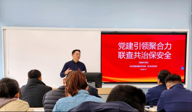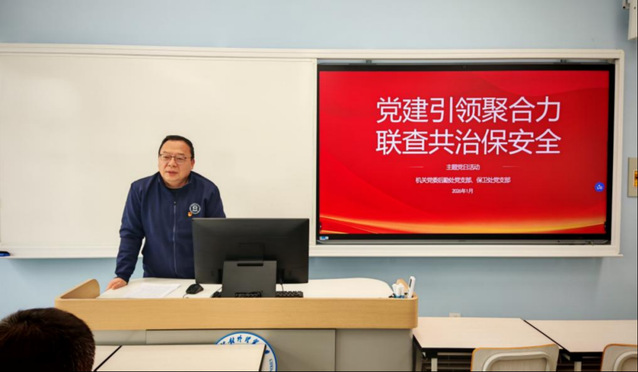活动伊始,后勤处党支部书记武增勇领学习近平总书记二〇二六年新年贺词中关于安全保障、民生服务的重要论述,结合校园后勤工作实际,解读民生与安全的紧密关联,强调要将贺词精神转化为守护师生校园生活安全的实际行动。随后,保卫处党支部书记李少丹领学党的二十届四中全会及党中央“十五五”规划建议中关于安全工作的重要论述,明确期末安全防控重点与协同方向。两支部党员结合岗位研讨,纷纷表示要以学促干,强化安全意识,以“时时放心不下”的责任感筑牢安全根基,凝聚协同共识。