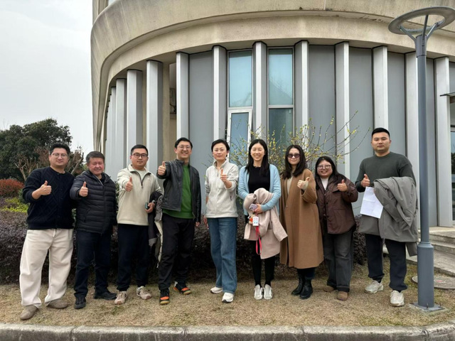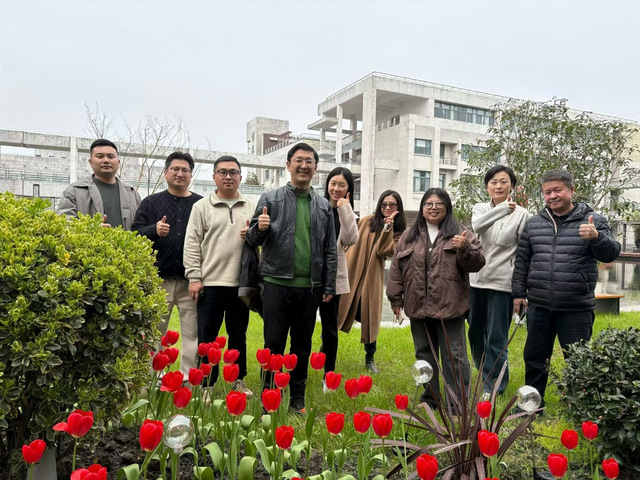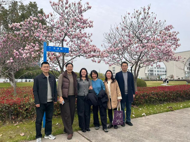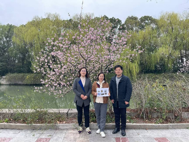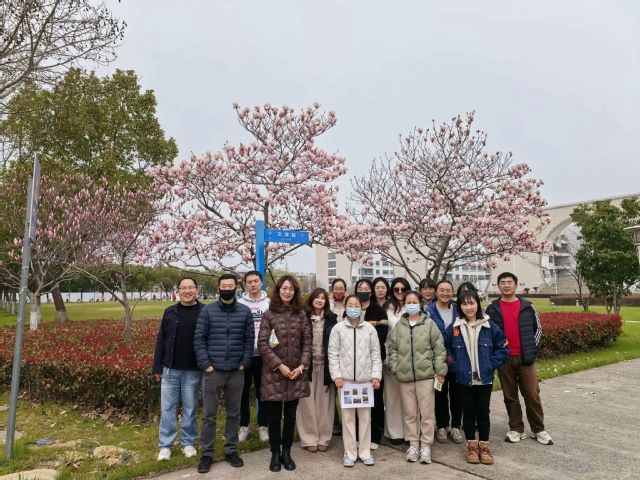 第四站来到了图书馆楼下梅花树,简约建筑线条与春日新芽相映,团队成员在此合影,定格工作场景中的春日景致,感受校园独特魅力。