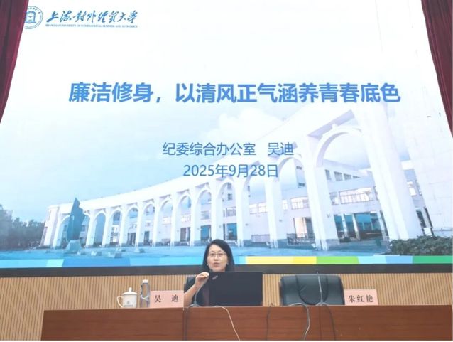 为进一步加强校园廉洁文化建设,提高师生的廉洁意识,学校纪委积极开展廉洁教育系列活动。9月28日,纪委综合办公室副主任吴迪在新生入学教育月期间为全体2025级学生做了“廉洁修身,以清风正气涵养青春底色”的专题讲座。
