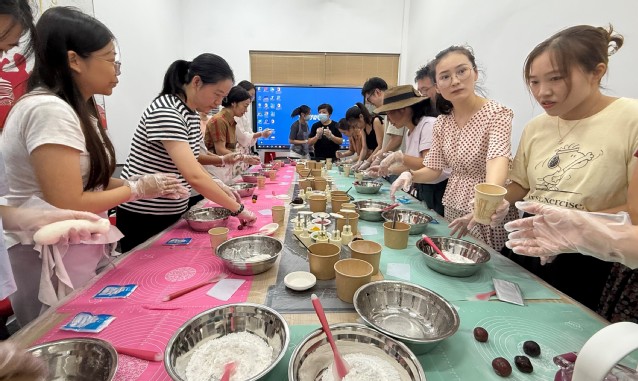 活动现场气氛热烈,老师们在专业师傅的指导下,亲手制作冰皮月饼。从和面、包馅到压模成型,大家兴致盎然,互相交流制作心得,现场欢声笑语不断。一个个精致可口的月饼不仅传递了节日的甜蜜,也凝聚了同事之间的协作与情谊。