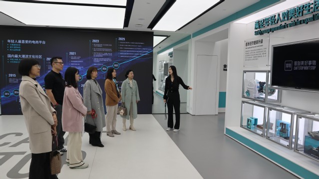 仪式后,学院一行实地参观了得物集团展厅。在展厅工作人员的细致讲解下,深入了解了得物的发展历程、核心产品矩阵及人工智能业务创新成果。通过近距离感受企业的创新氛围与运营模式,学院一行对得物的战略布局及未来人才需求方向有了更为直观和深刻的理解。
