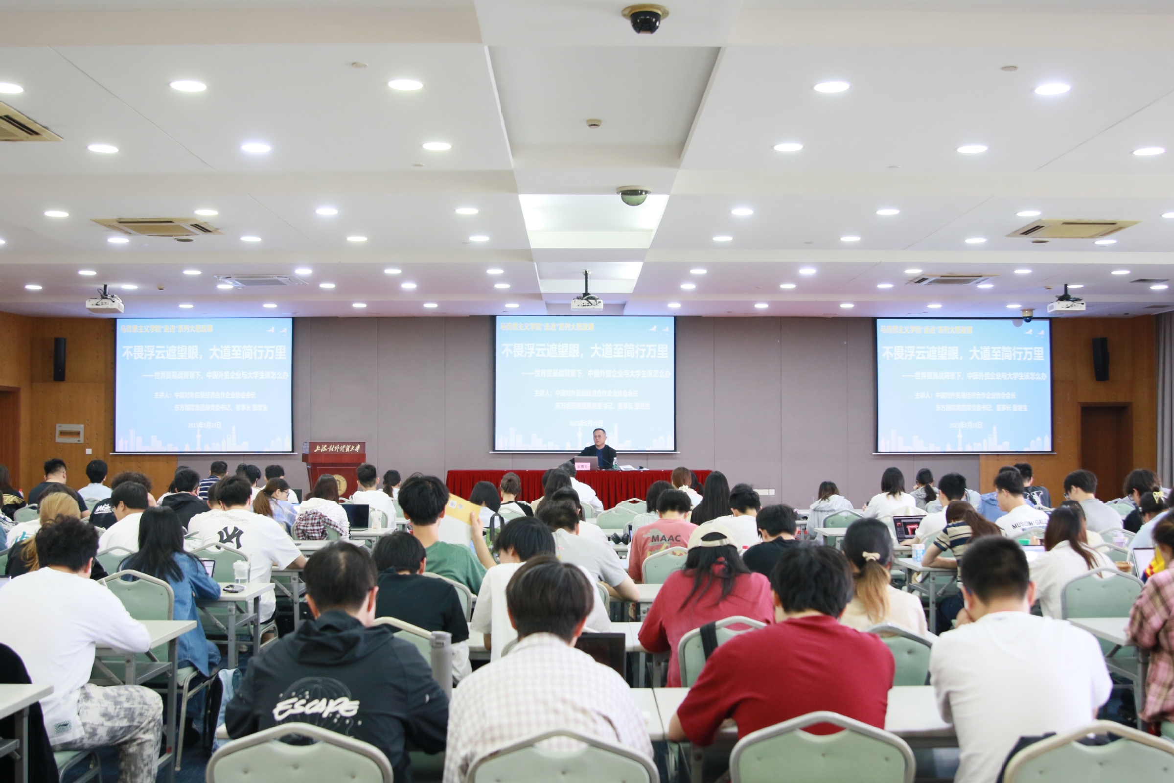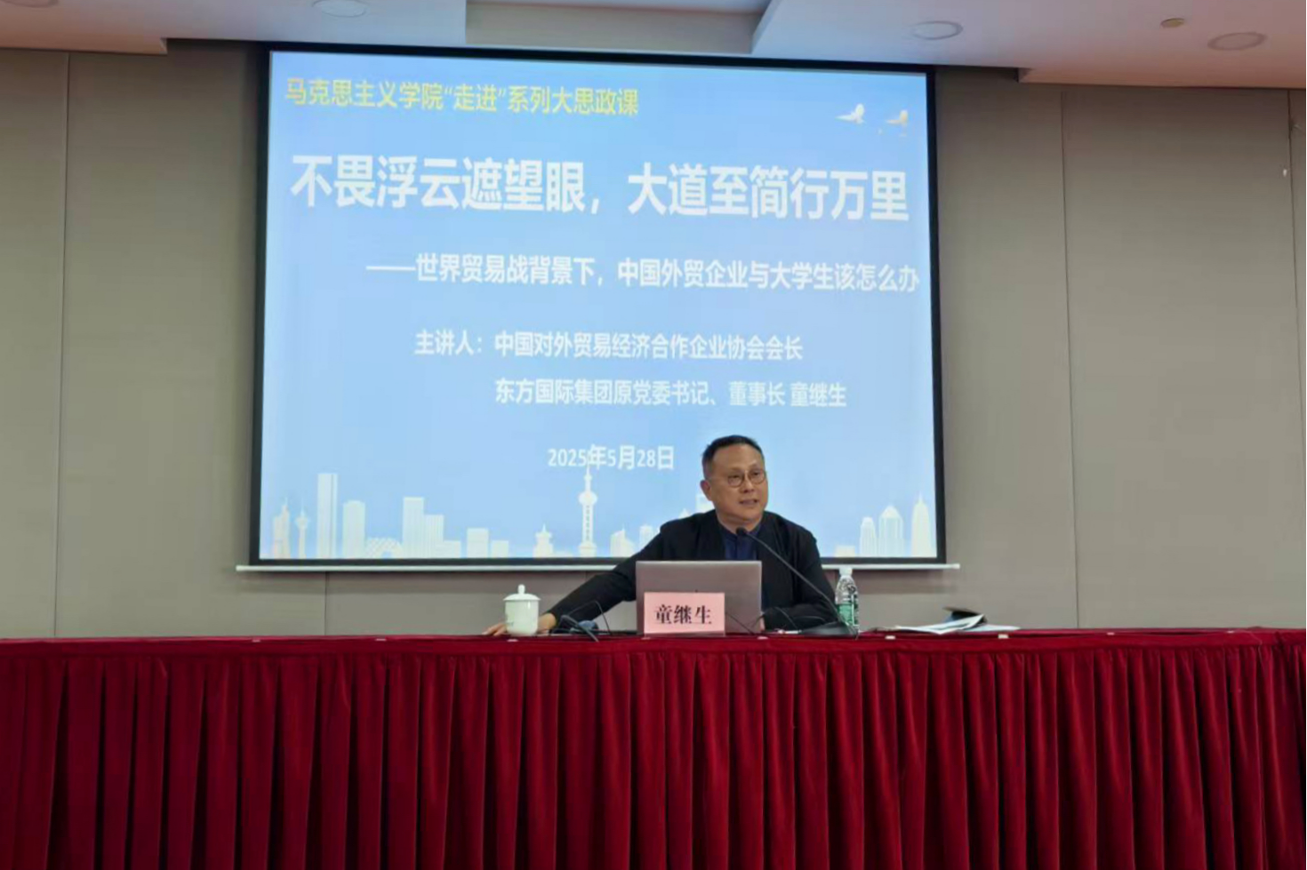 5月28日上午,上海对外经贸大学马克思主义学院“走进”系列大思政课开讲,邀请中国对外贸易经济合作企业协会会长、东方国际集团原党委书记、董事长童继生再次走进思政课课堂,以“不畏浮云遮望眼,大道至简行万里”为题,结合国有企业管理经历和人生阅历,为大学生生动讲述了在当前国际形势下,中国外贸企业与当代大学生的应对之策。《习近平新时代中国特色社会主义思想概论》课程的师生共同聆听本次“大思政课”。本次课程由上海对外经贸大学马克思主义学院党委书记刘海泉主持。