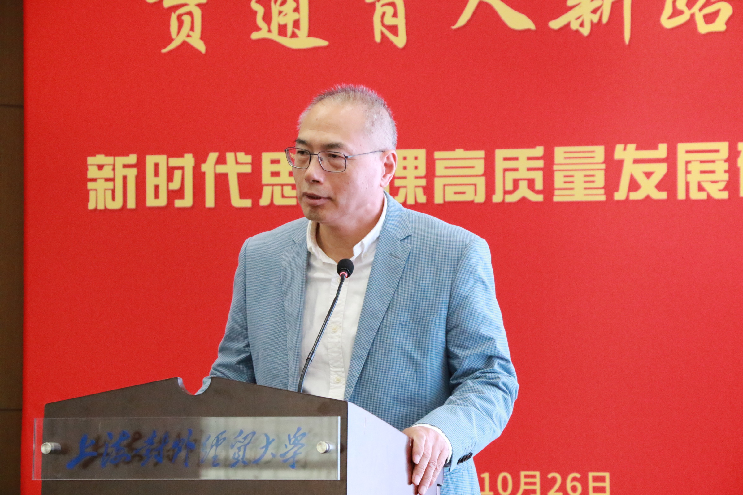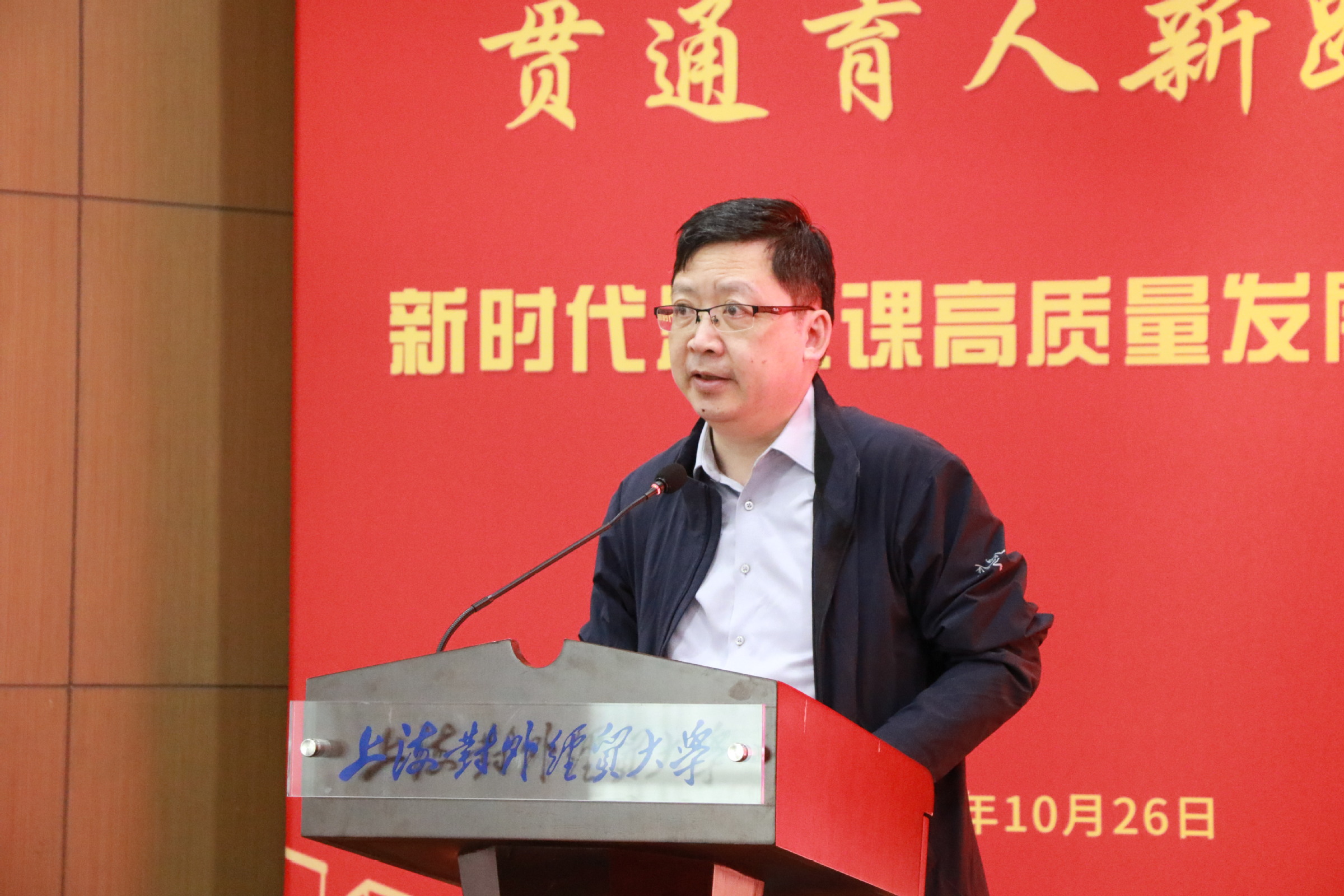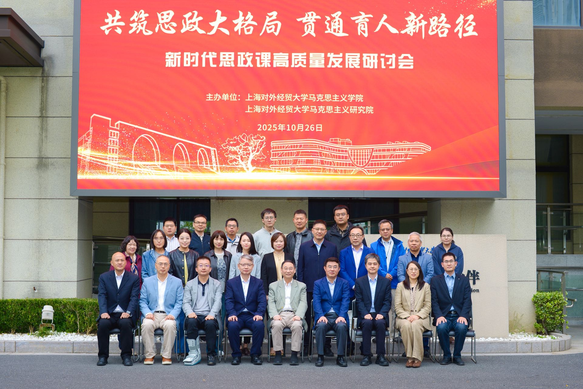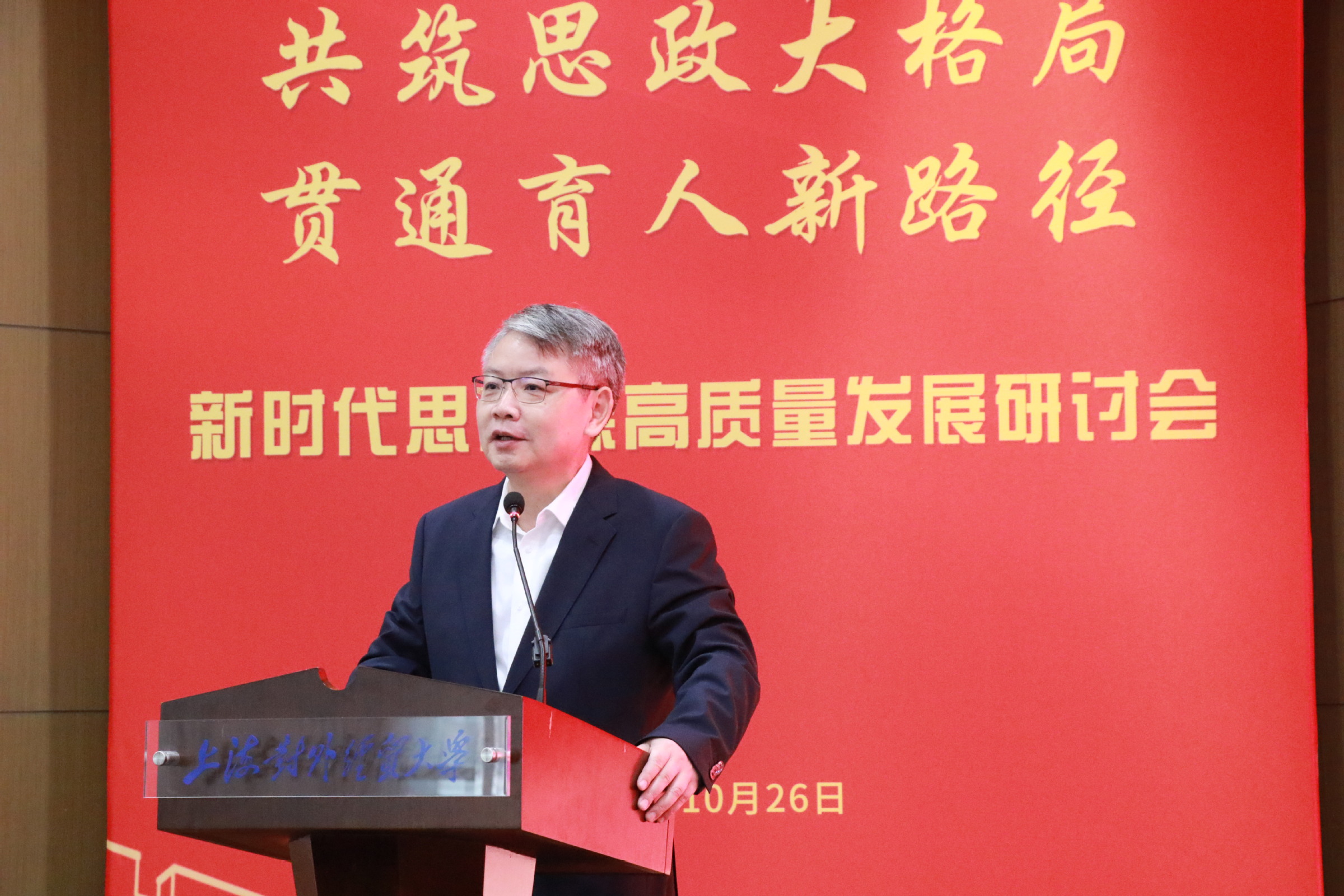 为深入学习贯彻习近平新时代中国特色社会主义思想和党的二十届四中全会精神,贯彻落实习近平总书记关于思政课建设的重要指示精神,扎实推进新时代思政课高质量发展,在学校成立65周年、马克思主义学院成立10周年之际,10月26日,上海对外经贸大学马克思主义学院和上海对外经贸大学马克思主义研究院共同举办了“共筑思政大格局,贯通育人新路径”——新时代思政课高质量发展研讨会。上海对外经贸大学党委书记祁明,上海市政府重大行政决策咨询专家、上海市大中小学思政课一体化建设指导委员会一体化建设专家指导组组长高德毅,上海开放大学党委书记闵辉,中共一大纪念馆党委书记、馆长薛峰,东华大学党委副书记、马克思主义学院院长王治东,上海市教委德育处副处长杨长亮,复旦大学马克思主义学院高国希教授,同济大学马克思主义学院陈大文教授等出席会议。来自上海市、安徽省、四川省的高校思政课教师,上海市松江区教育局,华东师范大学第一附属中学,上海对外经贸大学“大思政课”实践基地负责人以及我校专家学者共同参加研讨会。