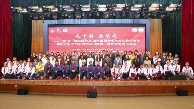 为全面贯彻落实党的二十大和二十届历次全会精神,深入学习贯彻习近平新时代中国特色社会主义思想,推动大中小学思想政治教育一体化建设,12月10日,由马克思主义学院和上海对外经贸大学附属松江实验学校教育集团联合举办的“走中国 看发展”——“两山”理念践行20周年暑期专项社会实践分享会暨松江区大中小思想政治教育一体化联盟展示活动在上海对外经贸大学附属松江实验学校思源剧场顺利举办。上海对外经贸大学党委书记祁明,松江区教育局副局长陈皇,松江区德育发展中心副主任薛红梅,校党委常委、教务处处长朱建明,校党委学(研)工部部长缪韵笛,校团委书记司徒力云,马克思主义学院党委书记刘海泉,马克思主义学院党委副书记刘诚洁,马克思主义学院副院长罗国辉,上经贸大附校及花园分校校长陈伟平,上经贸大附校党总支书记张辉,上经贸大附校花园分校党总支专职副书记高丽红及社会实践大中小学生团队代表、松江区大中小学思想政治教育一体化联盟——上经贸大附校及花园分校、松江区立达中学、松江区仓桥学校、松江区泖港学校师生代表共同参加了活动。