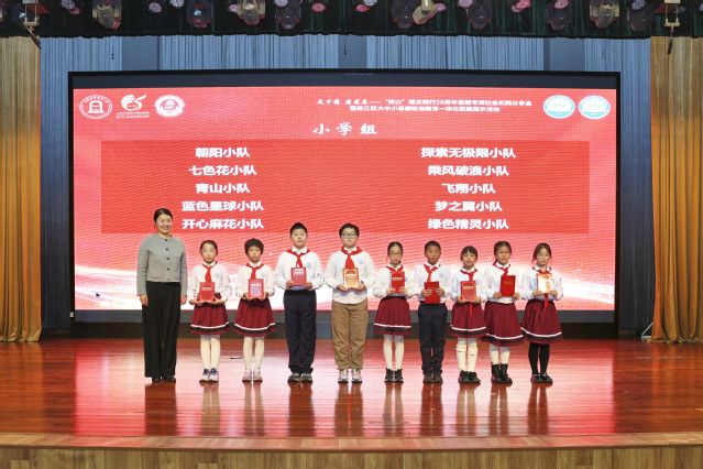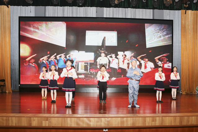 松江区泖港学校的学生代表则通过一场“时空对话”,深情表达了新时代青少年“祖国有我,请党放心”的坚定誓言,展现了将个人理想融入国家发展的青春担当。