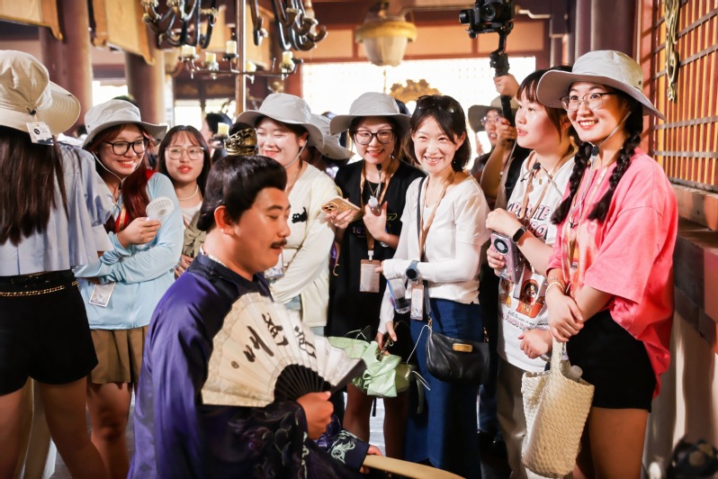 在享有“畅游一日,纵观亿年”之称,集独特性、历史性、知识性、艺术性、游乐性于一体的华夏文化主题公园内,师生们走进正在拍摄中的微短剧片场探班,了解短剧拍摄工种、现场流程,并采访演职人员,了解“横漂”一族的梦想与艰辛。