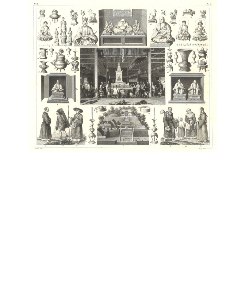 中央画面描绘的是广州西南部的华林寺某殿堂内的香火活动。画家将庙堂作为背景,细致描绘出人物的动作与神情。这幅图的最初蓝本出自法国画家奥古斯特·博尔热(August Borget, 1808-1877)的《中国和中国人》。原图中帷幔上的汉字是“功不补过”,而之后在阿罗姆的画面中字迹已经无法辨认。本图显然继承了阿罗姆的字迹。周边的八幅图示分别展示了当时中国常见的佛像、寺庙外观和僧侣形象。