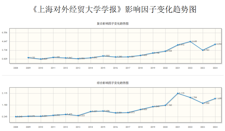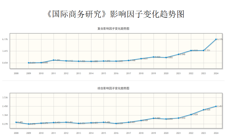 近日,中国知网发布了《中国学术期刊影响因子年报(人文社会科学.2025版)(以下简称《年报》)。根据《年报》关键计量指标显示,我社两本期刊《国际商务研究》和《上海对外经贸大学学报》都位于Q2区,是所属贸易经济学科的优秀期刊。在影响力指数(CI)方面,《国际商务研究》为258.562,在所属学科37本刊物中名列第13位;《上海对外经贸大学学报》为177.433,在所属学科中名列第15位,表明两本期刊的学术地位稳步提升。在2024年复合影响因子(复合JIF)方面,《国际商务研究》为6.176,较2023年提升73.92%,在所属学科中名列第8位;《上海对外经贸大学学报》为4.054,较2023年提升46.72%,在所属学科中名列第13位,反映两本期刊的文章被引频次明显增加,期刊的学术声誉与影响力得到显著提高。