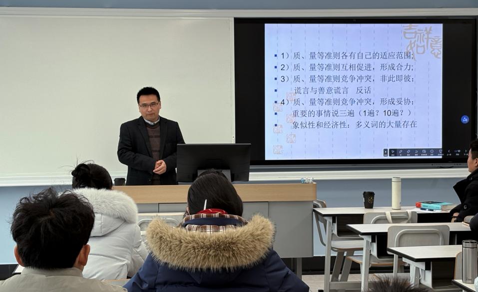 朱庆祥教授围绕“多动因互动”向学院师生作详细阐释,他表示,语言表达形式的多样性源于互动交流中不同功能、需求的相互作用,以“善意的谎言”“重要的事情说三遍”“一词多义的形成”等生活与教学实例,生动解析了数量、质量、相关、方式四大准则的互动关系,让抽象的理论变得具体可感。