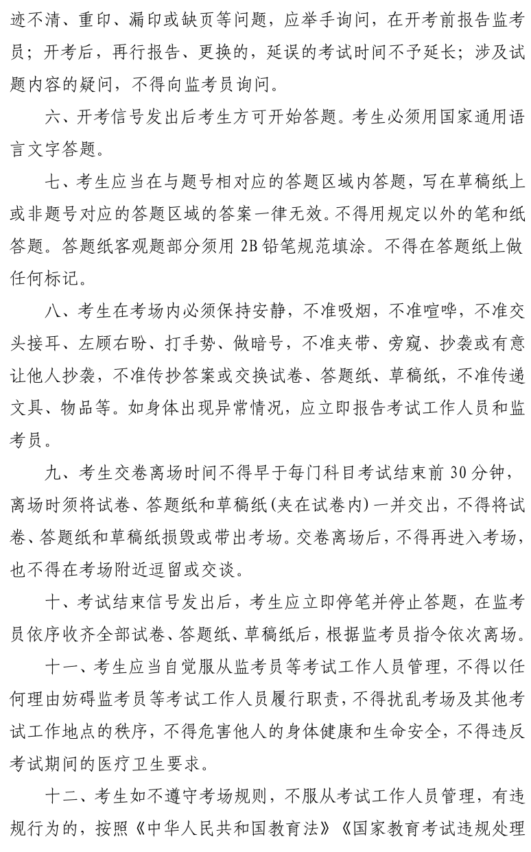 5.考试期间,请考生遵守考点统一发出的考试指令完成考试。所有考场均实行全覆盖、全时段网上监控和录像,监控视频和录像都将作为认定考试违规的依据。试题、答题卡、草稿纸等均属于涉考材料,不允许以任何形式拍照传出或带离考场。特别提醒,如在考试过程中发现考生随身携带手机等具有发送或者接收信息功能的设备,无论使用与否,均认定为考试作弊,取消当次考试所有科目成绩。